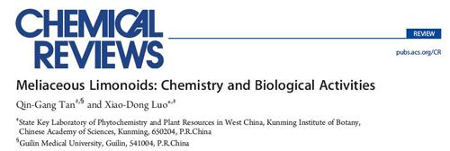 罗晓东研究员与谭钦刚博士在《化学评述》(Chemical Reviews, 2011, 111, 7437–7522. IF=40.197)发表了题为《楝科柠檬苦素:化学与生物活性》的综述文章,论文对近70年来关于楝科植物中柠檬苦素的化学与生物活性的988篇文献进行了分析和凝练。根据结构特征,把其间发表的1159个天然柠檬苦素划分为4大类型,31个亚型。归纳总结了它们的资源分布、合成与结构衍生、生物活性、构效关系、作用机制及化学分类意义,并对文献中存在的同名异物、异名同物的化合物进行了指正。此外,论文还简要介绍了印楝等在中国的栽培、应用现状。