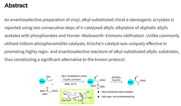 Synthesis of vinyl, alkyl-substituted chiral acrylates via Krische iridium complex-catalysed allylic phosphonation