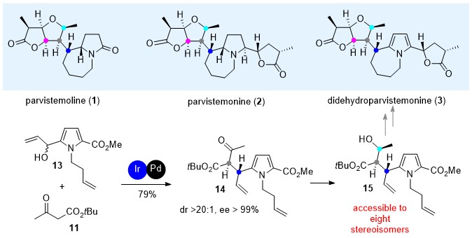 中国科学院昆明植物研究所植物化学与天然药物重点实验室的杨玉荣研究员团队,在多年来进行铱催化不对称烯丙基化的深入研究基础上,发展了一种独特的铱/钯双金属协同催化的β-酮酸酯烯丙基化反应,该反应能够以优秀的产率和高区域、高立体选择性构建具有两个连续手性中心的β-羰基酯产物,在深入研究反应机理和催化剂配体匹配性后,团队进一步拓展了该反应的底物适用范围,并将其巧妙的应用于细花类百部生物碱的合成策略中,首次实现了三个细花类百部生物碱——parvistemoline(细花百部次碱)、parvistemonine(细花百部碱) 和didehydroparvistemonine(脱氢细花百部碱)的不对称全合成。具体步骤包括:首先从易得的底物2-吡咯甲酸甲酯出发,通过手性Pd-烯醇盐和Ir-烯丙基络合物有机结合,以>20:1的dr值和>99%的ee值精准控制两个手性中心生成;随后通过Zn(BH4)2还原反应和Krische的铱催化反应完成另外两个手性中心的构型控制。接着由Oxy-Michael加成构建了四氢呋喃并-γ-丁内酯骨架,完成了parvistemoline的合成。此外,通过氧化态调整配合插烯Mannich反应或Krische 铱催化的烯丙基化反应分别引入单环内脂,以13和14步分别完成parvistemonine 和didehydroparvistemonine分子的手性全合成。该研究工作是催化不对称合成方法学与复杂天然产物全合成巧妙的有机结合,为后续相关百生物碱的全合成研究提供了新的策略和方法。