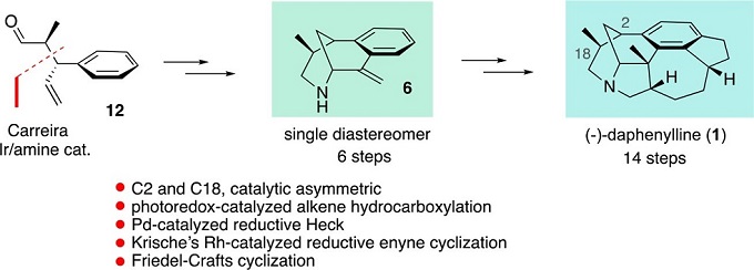 (图片来源:J. Am. Chem. Soc.) 正文 虎皮楠生物碱 (Daphniphyllum alkaloids) 由于其高度复杂的化学结构和优良的生物活性(抗肿瘤、抗HIV、抗氧化等),长期吸引合成化学家的研究兴趣。上世纪80-90年代美国化学家Heathcock曾作出过系统性和开创性的合成研究,随着更多结构新奇的天然产物不断被发现,近十余年,虎皮楠生物碱受到国内外合成化学家的空前高度关注,涌现出一批优秀的研究成果。(-)-Daphenylline是由中国科学院昆明植物研究所郝小江院士团队2009年从长序虎皮楠中分离得到含有迄今为止唯一一个具有苯环6/6/6/5/7/5 六环稠合的虎皮楠生物碱,分子中具有氮杂二环[3.3.1]壬烷结构单元,6 个手性中心,其中一个是全碳的季碳中心。如何快速构建其骨架并精确控制手性中心,成为了该生物碱全合成工作的主要难点。2013年,中国科学院上海有机化学研究所李昂研究员团队利用6π电环化为关键,首次完成了daphenylline的全合成。随后,该明星分子陆续被Fukuyama、翟宏斌、邱发洋、陆海华四个国内外研究组报道过全合成,李昂和邱发洋两个研究组更是运用不同策略两度报道该天然产物全合成。(注:在杨玉荣研究组刚刚报道后一周,美国Sarpong等人报道了daphenylline消旋全合成)。