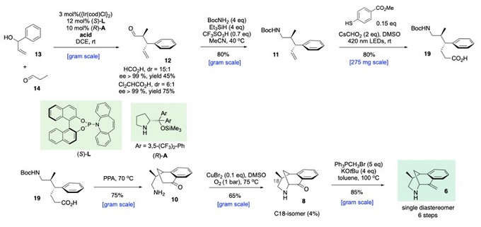 在分析前人合成策略时,不难发现以往不对称合成路线均从1个手性中心开始,如李昂研究组利用酶拆分获得C4手性原料,邱发洋研究组采用天然源C2手性原料,Fukuyama和陆海华采用不对称催化,但均选择了C10手性中心。以C2和C18两个连续手性中心开始的全合成策略尚未被人研究,考虑C18手性中心难于有效控制,在虎皮楠全合成中,文献常规的方法是用Ir或者Rh对其环外烯烃催化氢化,而Ir催化时常碰到反应重复性的问题。(注:即便在后来发表的Sarpong等人的合成中,作者使用强酸加热的剧烈条件,C18甲基出现大量异构化,其立体选择性控制仍是没有被解决)。鉴于此,杨玉荣研究组设计了运用Carreira铱胺双元催化精准控制两个关键C2和C18手性中心的合成策略。 根据作者反合成分析,桥头烯丙基胺6的制备是合成研究前面部分的关键。利用苯基乙烯基醇和丙醛在Carreira铱胺双元催化条件下,可高对映选择性和非对映体选择性方式以克级规模合成手性醛12,该醛紧接着发生还原胺化反应得到氨基甲酸酯11。为了延伸1个碳原子,作者创造性运用了2023年刚刚报道的Wickens光催化氢羧基化反应,顺利实现羧酸19的合成。羧酸19在PPA作用下发生第一次傅克酰化反应,同时将Boc基团从氮原子上脱除,生成双环一级胺10。参考MacMillan等人发展的分子间CuBr2催化酮的α-胺化反应条件,顺利实现桥头胺8的合成。最后,运用Wittig烯化将桥头胺8转化为桥头烯丙基胺6,这样6步就可以高效实现关键中间体桥头烯丙基胺的手性制备。