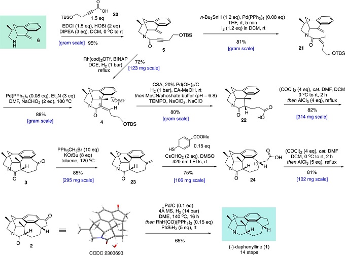 为了完成天然产物的全合成,作者接下来进行桥头烯丙基胺与已知炔酸20缩合反应得到酰胺5。在获得酰胺后,为了生成四环骨架并构建C5和C6的手性中心,作者先后运用了两种截然不同的策略。第一,先将酰胺5的炔键进行一锅Pd催化的锡氢化和脱锡碘化得到乙烯基碘化物21,然后再次利用Pd催化发生分子内还原Heck反应生成四环中间体4。第二,该化合物还可以通过对酰胺5进行Krische教授发展Rh催化1,6-烯炔环化反应一步直接获得。值得一提,Krische教授的方法学研究中,产物只有单环、缺少季碳取代的结构,没有出现像本全合成研究中四环并具有季碳手性的那样复杂体系。构建起四环结构后,利用一锅反应将环外双键立体专一性氢化、脱除TBS保护基以及伯醇氧化为羧酸22,新产生的C6手性中心是受底物控制的结果。羧酸22进行第二次傅克酰化反应后顺利关闭7元环生成五环酮3。随后将五环骨架进行Wittig烯化生成烯烃23,再次利用Wickens光催化氢羧基化反应将烯烃23转化为羧酸24,第三次傅克酰化反应成功关闭最后一个5元环得到六环酮2,该化合物的结构经过X-单晶衍射实验证明。最后,通过一锅反应先后把茚酮和内酰胺进行还原得到天然产物(-)-daphenylline。