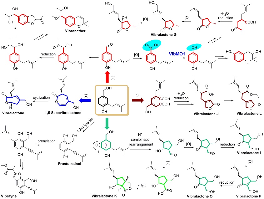 自然界的植物和真菌经过长期的生物进化,产生了极为特异的生物合成网络---次生代谢,由此造就了琳琅满目异彩纷呈的小分子天然产物。这些天然化合物作为生态系统的化学语言,往往只存在于某些特定的生物类群,从而赋予该物种特有的化学标识。除此以外,天然产物的药用和保健特性对人类健康需求至关重要。开展的研究工作如下: