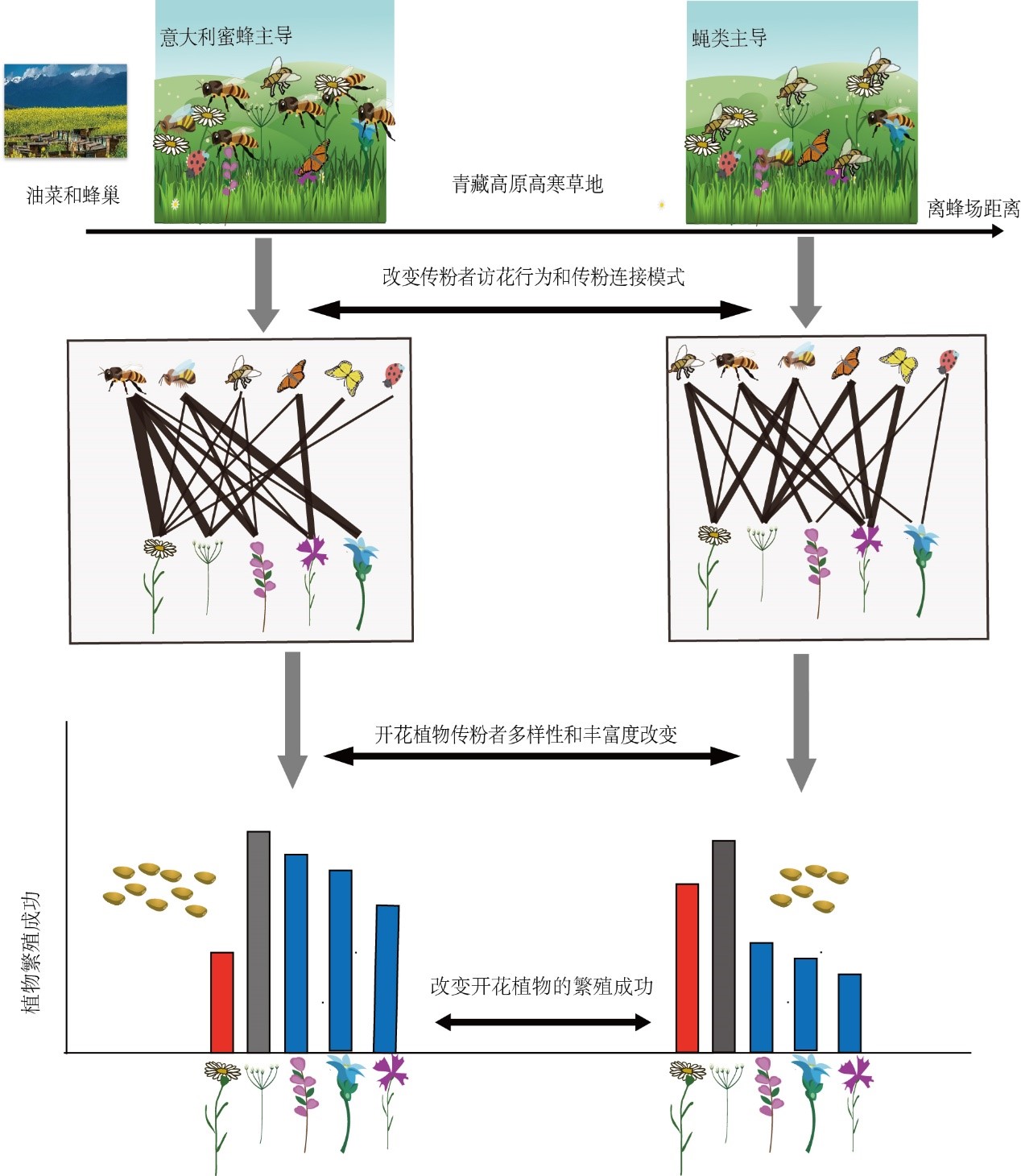 在人类活动持续增强的背景下,农业活动引入的非本地物种会对当地生物多样性和生态系统功能产生深远的影响。意大利蜜蜂(Apis mellifera)是最重要的管理授粉昆虫,养蜂人常根据油菜等蜜源植物的花期进行转场,从而为蜜源植物种植地引入大量非本地传粉昆虫。意大利蜜蜂属于超级泛化的传粉昆虫,除了访问油菜等蜜源植物外,也会溢出到油菜地附近的自然生境中访问当地野生植物,从而影响当地植物-传粉者互作网络的结构和传粉功能。课题组之前的研究表明青藏高原东北部的高寒草地开花植物最丰富的传粉者为蝇类(Wang et al., 2022, Frontiers in Plant Science),农业活动引入的意大利蜜蜂在白菜型油菜(Brassica rapa var. oleifera)的花期会访问自然生境中的大量野生植物,使当地最丰富的传粉者从蝇类转变为意大利蜜蜂(Wang et al., 2021, Ecology and Evolution)。因此,“油菜-意大利蜜蜂-野生植物”构成的系统为深入探究优势传粉者转变如何影响青藏高原高寒草地开花植物的繁殖成功提供了良好的条件。 近日,中国科学院昆明植物研究所青藏高原植物进化与适应专题组在青藏高原东北部高寒草地研究了农业活动引入的意大利蜜蜂和白菜型油菜对本地传粉者群落、植物与传粉之间的连接模式、多种开花植物繁殖成功的影响。研究结果表明,意大利蜜蜂的引入增加了本地传粉者之间的竞争,提高了本地传粉者的访花忠诚性,并且重新配置了植物与传粉者之间的连接模式,从而改变了高山植物的繁殖成功。本研究揭示了意大利蜜蜂通过改变本地传粉者的觅食行为来增强植物群落的授粉功能,证明了意大利蜜蜂的溢出效应对高山农业生态系统和周边自然生态系统授粉服务的潜在积极影响,为深入了解高山植物如何适应外来传粉者提供了新的理论视角。研究结果以“Mixed effects of honey bees on pollination function in the Tibetan alpine grasslands”为题在线发表在Nature Communications。