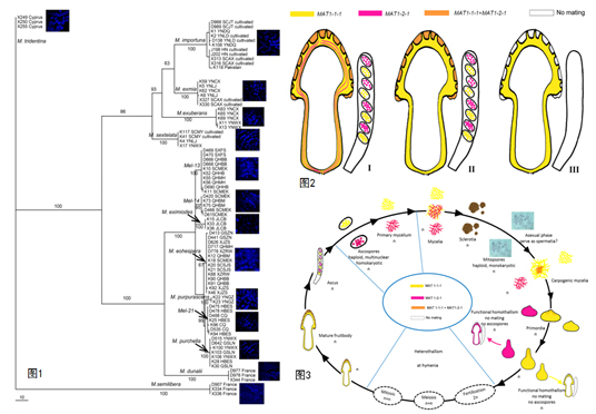 近年,中国科学院昆明植物研究所杨祝良研究员研究组通过国内外合作,由杜习慧博士等选取该属欧洲和亚洲的14个物种的223个子实体,对交配型基因及其在子实体不同部位分布的特点、子囊孢子的细胞核、有性生殖方式和生活史作了研究。(1)首次证明14种羊肚菌的有性生殖方式皆为异宗配合,即需要两种交配型基因同时存在,才能实现子实体正常发育和产生子囊孢子。在羊肚菌中,虽偶而也能发生单倍体(只含一种交配型基因)结实现象,但子实体不能产生子囊孢子。(2)在羊肚菌的生活史中,主要为单倍体阶段,其子囊孢子为多核的同核单倍体,有时有少量空核败育孢子。(3)交配型的分布有三种类型(见图2):在子实体不育组织中和子实层中,同时具有MAT1-1-1和MAT1-2-1交配型(I);在子实体不育组织中,只含有MAT1-1-1或MAT1-2-1交配型,但在子实层中,却同时含有MAT1-1-1和MAT1-2-1交配型(II);在子实体不育组织和子实层中,只含有MAT1-1-1或MAT1-2-1交配型,无交配,最终子囊中不产生子囊孢子(III)。在栽培的子实体不育组织中,多数含有MAT1-1-1和MAT1-2-1两种交配型;而在野生子实体不育组织中,多数只含一种交配型,而且交配型MAT1-1-1远多于MAT1-2-1。(4)利用交配型基因的核苷酸序列构建系统发育树,能很好地区分近缘物种(图1)。(5)根据上述研究结果,提出了羊肚菌的生活史框架。研究结果以“Mixed-reproductive strategies, competitive mating-type distribution and life cycle of fourteen black morel species”为题在线发表于Scientific Reports。